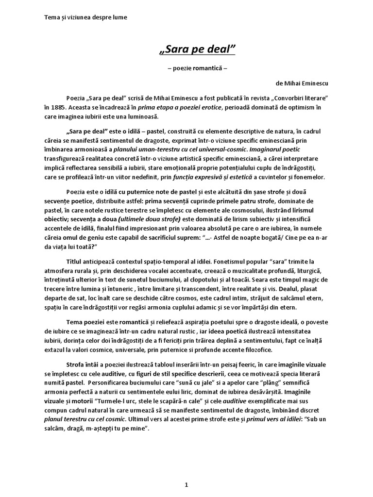 Eminescu Sara Pe Deal Comentariu